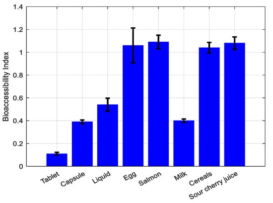Bioaccessibility indices of supplements: tablet; capsule; liquid; and foods: egg, salmon, milk, cereals, sour cherry juice.