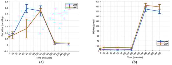 Effect of gastric pH on (a) primary oxidation and (b) secondary oxidation of sunflower seed oil. On x-axis, 0 min refers to the initial concentration, 15 min refers to the concentration after oral phase, 75 and 135 min refer to the concentration after the first and second hours of gastric phase, and 195 and 225 min refer to the concentration after the first and second hours of intestinal phase.
