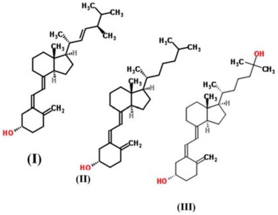 Chemical structures of main dietary forms of vitamin D: (I) ergocalciferol (vitamin D2), (II) cholecalciferol (vitamin D3), (III) 25-hydroxy-cholecalciferol (25(OH)D3) [8].