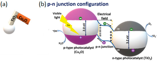 (a) Schematic representation of TiO2/Cu2O micromotors and (b) schematic illustration depicting the transfer of charges in a heterostructure with a p–n junction. Reprinted with permission from [43] (Copyright © 2018 WILEY-VCH).