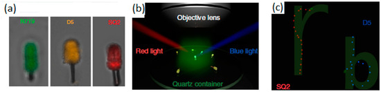 Fluorescence mapping images of the dye-sensitized nanomotors reveal the selective loading of all three dyes onto the surface of TiO2 nanowires (a); diagram of the experimental arrangement that illustrates the use of blue (475 nm) and red (660 nm) side lighting to manipulate the alignment of nanomotors (b); trajectory of SQ2 (red) and D5 (blue) sensitized nanomotors that naturally trace the letters ‘r’ and ‘b’ under the influence of blue and red light, respectively (c). Adapted from [65] (Licensed under an open-access Creative Commons CC BY 4.0 license).