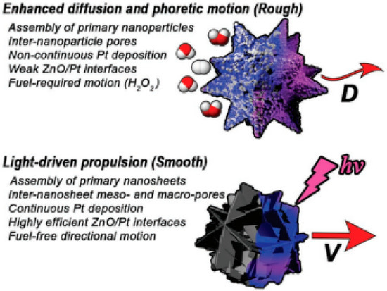 Despite all this, some studies have recently described the use of nanowires and nanorods morphology, as shown in Table 1 [29,45,47,49]. Ji et al. describe Au/Fe2O3 nanomotors with propulsion activated by Vis light and with a propulsion mechanism based on self-electrophoresis, a consequence of the shape and size (nanorods) [49]. The incidence of Vis light with a greater intensity (33 mW.mm2) and shorter wavelength (less than 552.2 nm), especially in the semiconductor part of the nanorods, generated a more evident distribution of electrons (diffusion and migration of protons), resulting in faster propulsion (30.7 µm·s−1). Sb2Se3/ZnO nanowires were described for drug delivery potential, considering the effective control of these motors to the type of light used to stimulate movement [47]. Due to the nanowire-shaped crystalline structure, these Sb2Se3/ZnO nanowires exhibit the preferential absorption of light polarized parallel to the nanowires, resulting in a propulsion speed three times faster under parallel polarized light than perpendicular polarized light. This proof-of-concept study demonstrated the importance of the nanowire structure associated with other surface characteristics for optimizing self-propulsion and obtaining more efficient micro/nanomotors. However, in addition to the structure, the surface characteristics, namely crystallinity, mesoporosity, surface area, and roughness, among others, are characteristics widely studied, in their individualized form or in combination, to improve the propulsion/activity of recently described micromotors.
