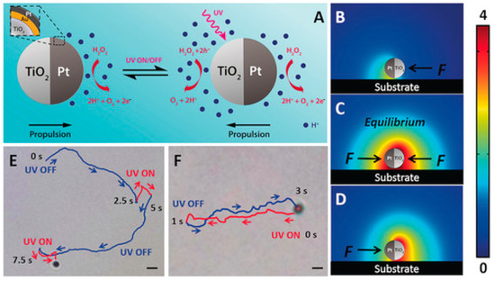 In other words, as bubbles are released from the surface of the motors, resulting from the mostly redox reactions that occur, this unleashes a driving force away from the surface of the motors [16,17]. It is essential to highlight that in these cases, the driving force is assumed to be balanced with the viscous drag force if the vertical forces are ignored.