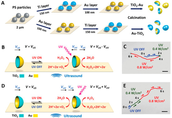 - Wang, L.; Popescu, M.N.; Stavale, F.; Ali, A.; Gemming, T.; Simmchen, J. Cu@TiO2 Janus microswimmers with a versatile motion mechanism. Soft Matter 2018, 14, 6969–6973. [Google Scholar] [CrossRef]
