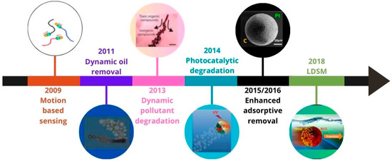 Micro/nanomotors are small devices capable of moving autonomously in a liquid medium using catalytic reactions or an external stimulus (chemical fuels, magnetic, ultrasound, or light). The main features generating the movement of these motors are morphological asymmetry (generally created by the deposition of metals on one side of the motors, creating two distinct hemispheres) and the consumption of chemical fuels, as presented later in more detail. Such small automotive devices were recognized for performing sophisticated tasks while moving in different liquid media, which allows them to be applied in the most diverse areas, namely detection, biomedicine, and environmental remediation [1]. This versatility has made these micro/nanomotors one of the most promising research topics worldwide.