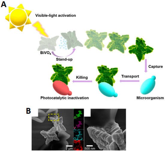 - Villa, K.; Novotný, F.; Zelenka, J.; Browne, M.P.; Ruml, T.; Pumera, M. Visible-Light-Driven Single-Component BiVO4 Micromotors with the Autonomous Ability for Capturing Microorganisms. ACS Nano 2019, 13, 8135–8145. [Google Scholar] [CrossRef] [PubMed]