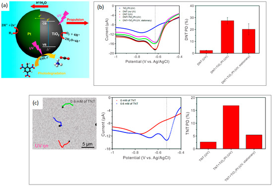 - Kong, L.; Mayorga-Martinez, C.C.; Guan, J.; Pumera, M. Fuel-Free Light-Powered TiO2/Pt Janus Micromotors for Enhanced Nitroaromatic Explosives Degradation. ACS Appl. Mater. Interfaces 2018, 10, 22427–22434. [Google Scholar] [CrossRef] [PubMed]