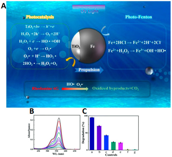 - Wang, J.; Dong, R.; Yang, Q.; Wu, H.; Bi, Z.; Liang, Q.; Wang, Q.; Wang, C.; Mei, Y.; Cai, Y. One body, two hands: Photocatalytic function- and Fenton effect-integrated light-driven micromotors for pollutant degradation. Nanoscale 2019, 11, 16592–16598. [Google Scholar] [CrossRef]