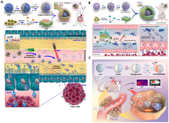- Wang, Z.; Huang, W.; Zhang, S.; Chu, M.; Yin, N.; Zhu, C.; Zhang, Z.; Shi, J.; Liu, J. Self-Thermophoretic Nanoparticles Enhance Intestinal Mucus Penetration and Reduce Pathogenic Bacteria Interception in Colorectal Cancer. Adv. Funct. Mater. 2023, 33, 2212013–2212041. [Google Scholar] [CrossRef]