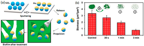- Maric, T.; Løvind, A.; Zhang, Z.; Geng, J.; Boisen, A. Near-Infrared Light-Driven Mesoporous SiO2/Au Nanomotors for Eradication of Pseudomonas aeruginosa Biofilm. Adv. Health Mater. 2023, 12, e2203018. [Google Scholar] [CrossRef] [PubMed]