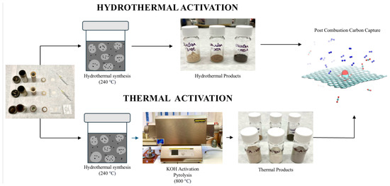 Therefore, developing efficient, ecological, and low-cost CO2 capture materials is urgently required. Porous materials such as activated carbons [15,16], carbon nanotubes [17,18], covalent–organic frameworks [19,20], metal–organic frameworks [21,22,23,24], zeolites [25,26,27], mesoporous silicas [28,29,30], and natural materials based on nanoporous shales, limestones, and foams [31,32,33,34] stand out as promising frontiers in the quest for effective carbon capture and storage technologies. Recently, sorbents based on activated porous carbons (APC) have received increased interest because of their unique physio-chemical properties, such as high surface area [35,36], tunable pore distribution [37], and the possibility of chemical modification for enhanced affinity to CO2 molecules [38,39,40]. Additionally, their low isosteric heat of adsorption allows for effective regeneration after CO2 adsorption and enables them to resist moisture, making APCs more economically and energetically feasible in industrial CO2 capture. Furthermore, their production cost can be further decreased by utilising biomass as the primary precursor. Chemical or physical activations are frequently used methods to develop effective APCs with high porosity. Hence, our research aimed to develop novel biomass-based activated carbons with low production cost and investigate the effect of hydrothermal and thermal activation methods on the development of their textural properties, which largely influence the material’s CO2 adsorption capacity.