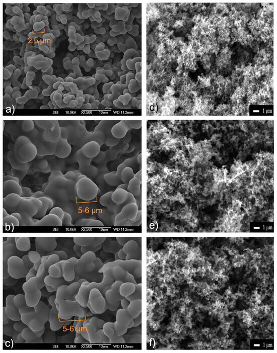 SEM images (Figure 2) with magnification 2500× were used to evaluate the morphologies of the prepared samples. The hydrothermal products (see Figure 2a–c) display regular spherical morphologies with smooth surfaces, which are directly linked to the particle size (~2.5 μm for C+MELA, ~5–6 μm for C+BAPE, and ~5–6 μm for C+DETA) and shape of the used amines. As seen in Figure 2d–f, thermal activation led to irregular fibrous structures with smaller particle sizes, which can be attributed to both the activating agent and the thermal treatment. While KOH activation led to the development of porosity via pitting and channelling [47], high thermal activation resulted in the loss of volatile matter, causing the formation of voids, which significantly enhanced the degree of porosity and created a well-developed porous matrix observable in the thermal samples.