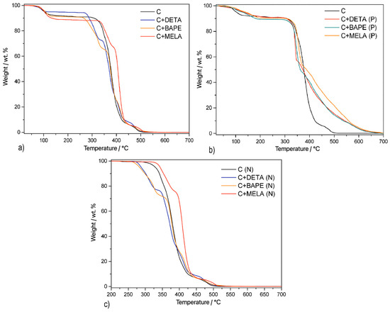 TG curves for the thermal samples are shown in Figure 5b. As indicated in Table S1 in Supplementary Materials, the decomposition of the thermal compounds initially proceeded by dehydration of the products in the first step, which was accompanied by weight losses of 9.1 wt. %, 10.7 wt. %, and 8.2 wt. % for C+DETA (P), C+BAPE (P), and C+MELA (P), respectively. Subsequently, the dehydrated compounds acquired thermal stability up to a temperature of 283.5 °C for C+DETA (P), 291.6 °C for C+BAPE (P), and 300.0 °C for C+MELA (P). The decomposition of the porous structures of the materials occurred in two mass losses in a wider temperature interval up to 700 °C, which is higher than in the case of hydrothermal products. However, due to the undefined composition of the materials caused by the further development of the carbon matrix during pyrolysis (see Section 3.3), it was not possible to assign individual weight losses clearly.