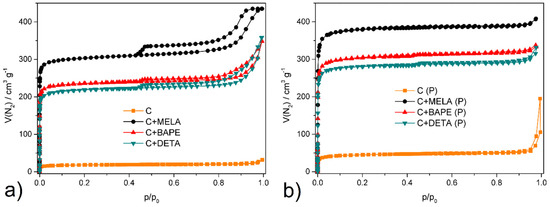 In terms of BET surface areas (SBET) and pore volumes (Vp, see Table 3), more enhanced degrees of porosity were observed on the thermal samples, with the highest values of 1348 m2 g−1 and 0.628 cm3 g−1 being reported on melamine-containing material, followed by samples doped with 1,2-bis(3-aminopropylamino)ethane (1076 m2 g−1; 0.502 cm3 g−1) and diethylenetriamine (998 m2 g−1; 0.488 cm3 g−1). This can be attributed mainly to KOH chemical activation promoting the formation of micro- and mesoporous-activated carbon [53]. The hydrothermal samples displayed well-developed porosity as well, with smaller surface areas compared to the pyrolysed products. The most significant values were observed on melamine APC (1079 m2 g−1; 0.511 cm3 g−1), followed by 1,2-bis(3-aminopropylamino)ethane (833 m2 g−1; 0.473 cm3 g−1) and diethylenetriamine (769 m2 g−1; 0.378 cm3 g−1). Therefore, it can be concluded that, in terms of textural properties, thermal activation led to a significant enhancement of specific surface area values, as seen in Figure 7 and Table 3.