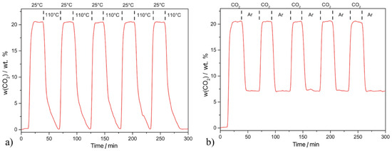Cyclic thermogravimetric CO2 adsorption/desorption curve on C+MELA measured at 25 °C via (a) thermal regeneration at 110 °C and (b) argon purging at 25 °C.