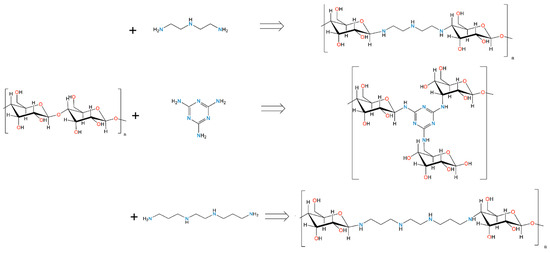 Figure 11 illustrates the synthesis of cellulose–amine porous materials. Hydrothermal samples (see Figure 1, up) were prepared by mixing 1.3 g (8.02 mmol) of microcrystalline cellulose and 1.3 g of certain amines (diethylenetriamine (DETA) 12.60 mmol, 1,2-bis(3-aminopropylamino)ethane (BAPE) 7.46 mmol, and melamine (MELA) 10.31 mmol), which were placed in lined steel Parr autoclaves with 45 mL volume. Then, 27 mL of deionised water (DI) was added to the autoclaves using a pipette. The reaction vessels were sealed and placed into an oven to undergo hydrothermal activation at 240 °C for 8 h at a heating rate of 3 °C min−1 with subsequent cooling at 1 °C min−1. After cooling, the suspensions were washed with DI water using the Büchner funnel and dried at 120 °C in the oven overnight. The resulting hydrothermal products were denoted as C+DETA, C+BAPE, and C+MELA, yielding 0.49 g, 0.86 g, and 1.03 g, respectively.