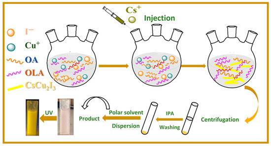 Chemicals. The chemicals included the following: copper(I) iodide (CuI, Sigma (St. Louis, MO, USA), 99.9%), copper(I) chloride (CuCl, Sigma (St. Louis, MO, USA), 99.9%), cesium carbonate (Cs2CO3, Aladdin (Shanghai, China), 99.9%), 1-octadecene (ODE, Macklin (Shanghai, China), 90%), oleic acid (OA, Aladdin (Shanghai, China), 85%), oleylammonium (OLA, Adamas-beta (Shanghai, China), 90%+), hydroiodic acid (HI, Aladdin, 58 wt%), and isopropyl alcohol (IPA, Sigma-Aldrich, (St. Louis, MO, USA) ≥99.7%). All chemicals were used as purchased, without further purification.