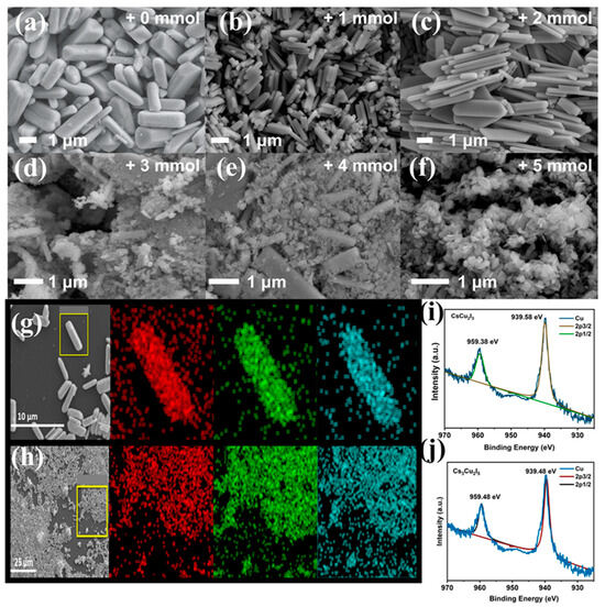 (a–c) SEM images of CsCu2I3 microscale crystals with OLA-I amounts of 0, 1, and 2 mmol. (d,e) SEM images of CsCu2I3/Cs3Cu2I5 composites with OLA-I amounts of 3 and 4 mmol. (f) SEM images of Cs3Cu2I5 nanocrystalline with OLA-I amount of up to 5 mmol. (g) Chemical composition revealed by EDS elemental mapping for CsCu2I3 MRs and (h) Cs3Cu2I5 NCs (red: Cs; green: Cu; blue: I). (i) High-resolution XPS spectrum of Cu (2p1/2 and 2p3/2) of CsCu2I3. (j) High-resolution XPS spectrum of Cu (2p1/2 and 2p3/2) of Cs3Cu2I5.