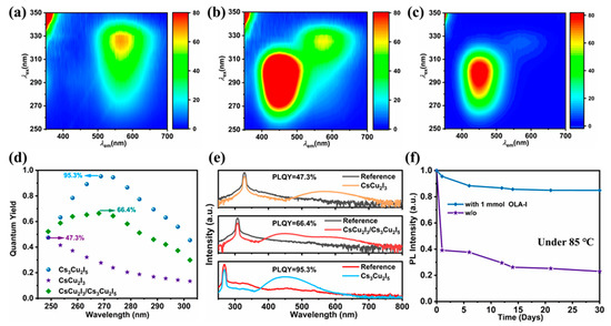 (a–c) Excitation emission matrix plots of the synthesized CsCu2I3, CsCu2I3/Cs3Cu2I5, and Cs3Cu2I5. (d) PLQYs of Cs3Cu2I5, CsCu2I3, and CsCu2I3/Cs3Cu2I5 with different excitation wavelengths. (e) PLQY spectra of the optimal values. (f) Evolution of the PL intensity of 0 and 1 mmol OLA-I-treated CsCu2I3 under 85 °C environment over 30 days for stability investigation.