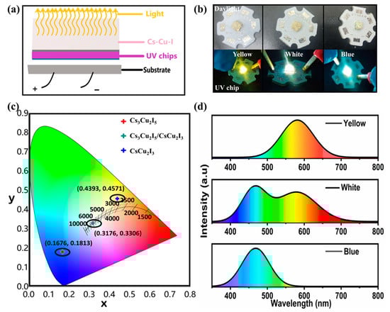 To realize device application, as illustrated in Figure 6a, the as-grown Cs-Cu-I products dispersed in polystyrene (PS) were coated on a commercial UV LED chip (around 310 nm). The corresponding emission photographs can be found in Figure 6b, which demonstrate strong yellow, white, and blue luminescence features when operated at a forward bias current of 20 mA. The calculated Commission Internationale d’Eclairage (CIE) color coordinates of the luminescence of the LED devices are described in Figure 6c. The calculated CIE coordinates were (0.4393, 0.4571) for the yellow LED and (0.1676, 0.1813) for the blue LED. For the white LED, the calculated CIE coordinates, color rendering index (CRI), and correlated color temperature (CCT) values were (0.3176, 0.3306), 90, and 6234 K, which are comparable to those of the light-emitting diodes of other copper-based halides. Additionally, the PL spectra of working yellow, white, and blue LED devices are further presented in Figure 6d, which are consistent with the system of Cs-Cu-I powder samples. These results suggest the great promise of these copper halides for practical LED application. Specifically, we summarize the recent advances in the preparation of a variety of unique copper halides and several representative works are shown in Table S2 [46,53,71,72,73,74,75,76,77,78,79]. Considering the existing progress achieved in multifarious optoelectronic applications and their associated challenges, the further development described in this work provides a new perspective for the engineering of the luminance properties of copper halides through modification with OLA-I treatment.