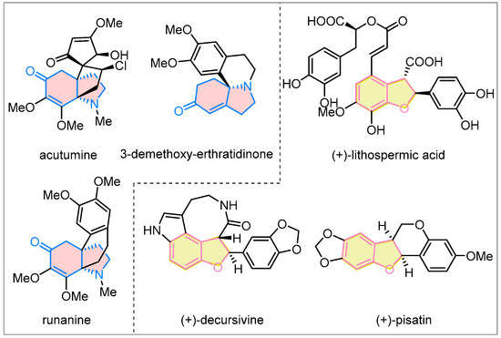 Natural products containing hydroindoline-5-one or 2,3-dihydrobenzofuran cores.