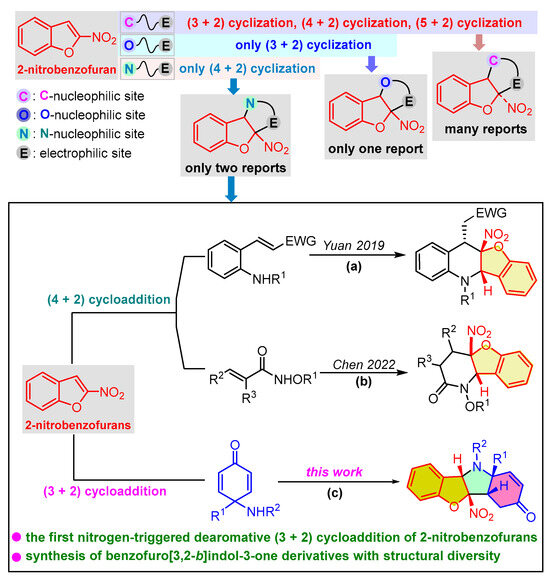 In recent years, extensive research on the dearomative cyclization reaction of 2-nitrobenzofuran has revealed the significant potential of this strategy in the construction of polycyclic compounds containing a 2,3-dihydrobenzofuran core (Scheme 1, top) [26,27,28]. Among the numerous transformations with respect to the dearomative cyclization reaction of 2-nitrobenzofurans, the carbon nucleophile-triggered dearomative (3 + 2), (4 + 2), and (5 + 2) cyclization reactions have been extensively studied [29,30,31,32,33,34,35,36]. In contrast, there have been limited reports on oxygen or nitrogen nucleophile-triggered dearomative cyclization reactions so far. You and co-workers reported on the only reaction of oxygen nucleophile-triggered dearomative (3 + 2) cyclization between 2-nitrobenzofurans and epoxybutenes for the straightforward construction of tetrahydrofurobenzofurans with a chiral palladium catalyst [37]. In addition, there are two reports so far on dearomative cyclization reactions of 2-nitrobenzofurans triggered by nitrogen nucleophiles [38,39]. One is the asymmetric dearomative (4 + 2) cycloaddition reaction reported by our group, involving 2-nitrobenzofurans and 2-aminochalcones to construct tetrahydrobenzofuro[3,2-b]quinolines by using a chiral squaramide catalyst (Scheme 1a) [38]. The other is the base-catalyzed (4 + 2) cycloaddition reaction between 2-nitrobenzofurans and N-alkoxyacrylamides to access [3,2-b]benzofuropyridinones (Scheme 1b) [39]. These precedents have demonstrated the great potential of heteroatomic nucleophile-driven dearomative cyclization reaction of 2-nitrobenzofurans in the construction of complex polyheterocyclic compounds. On the other hand, much attention has been paid to the application of para-quinamines as three-atom building blocks for the cascade reaction to construct nitrogen-containing heterocycles with structural diversity [40,41,42,43,44,45,46,47,48]. Para-quinamines are often used as N-nucleophiles to undergo (3 + 2) cycloaddition with two-atom reaction partners, thus leading to the formation of hydroindoline-5-one scaffolds [49,50,51,52,53]. Therefore, we speculated that conducting the dearomative (3 + 2) cycloaddition reaction between para-quinamines and 2-nitrobenzofurans would lead to the fusion of hydroindoline-5-one and 2,3-dihydrobenzofuran. As part of our ongoing research on the dearomatization of electron-deficient heteroarenes [54,55,56,57], herein, we will report the first nitrogen nucleophile-triggered dearomative (3 + 2) cycloaddition reaction of 2-nitrobenzofurans by using para-quinamines to construct benzofuro[3,2-b]indol-3-one skeletons (Scheme 1c).