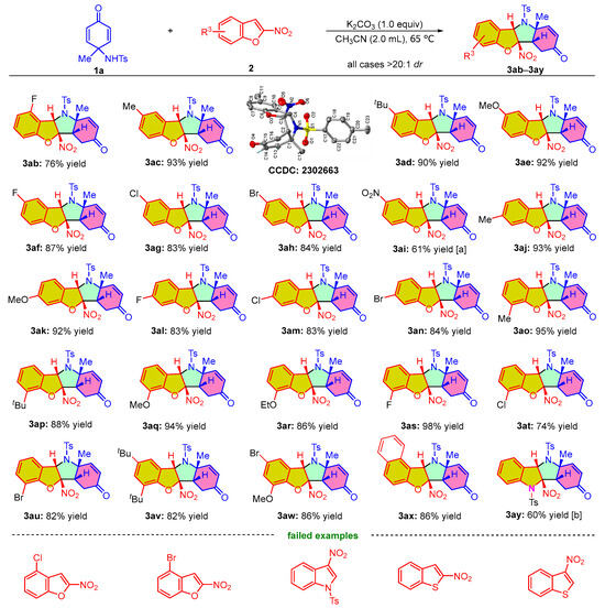 Substrate scope on the dearomative (3 + 2) cycloaddition reaction of various 2-nitrobenzofurans 2 with para-quinamines 1a. Reaction conditions: unless otherwise noted, the reactions were carried out with 1a (0.15 mmol), 2 (0.10 mmol), and K2CO3 (1.0 equiv) in 2.0 mL of acetonitrile at 65 °C for 2 days. The dr values were determined by 1H NMR analysis. The yields refer to the isolated yield of product. [a] The reaction was carried out for 3 days. [b] The reaction was carried out with 1a (0.15 mmol), 2y (0.10 mmol), and Cs2CO3 (1.0 equiv) in 2.0 mL of acetonitrile at 25 °C for 12 h.