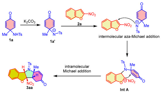 In order to further provide a more comprehensive explanation for the dearomative (3 + 2) cycloaddition reaction, we propose a possible reaction mechanism according to the experimental results. As outlined in Scheme 5, using the reaction between para-quinamine 1a and 2-nitrobenzofuran 2a as an example, under the promotion of an inorganic base, the in situ-generated intermediate 1a′ from 1a undergoes an intermolecular aza-Michael reaction by attacking the C3-position of 2-nitrobenzofuran 2a, which leads to the dearomatization of 2-nitrobenzofuran and the formation of intermediate Int A. Subsequently, an intramolecular Michael addition of intermediate Int A occurs and gives rise to the fusion of hydroindoline-5-one and 2,3-dihydrobenzofuran, thus producing the polycyclic benzofuro[3,2-b]indol-3-one 3aa.