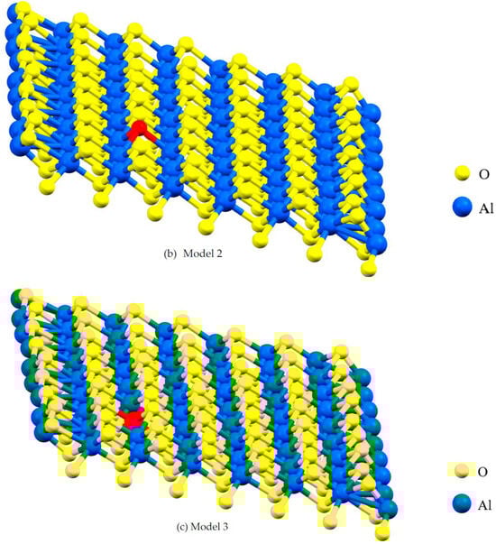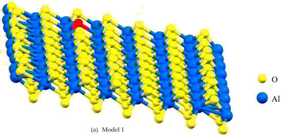 Vacancies can affect mechanical and electronic properties, and their proportion and position are critical factors in modeling with DFT. Vacancies change stress distribution and local strain fields, influencing mechanical properties such as strength, ductility, and fracture toughness. Furthermore, vacancies give rise to localized conditions within the electronic band configuration, leading to changes in electronic characteristics, including electrical conductivity and optical attributes. The percentage of vacancies significantly influences factors such as stress concentration, the initiation and spread of dislocations, deformation mechanisms, and the quantity and spatial distribution of localized electronic states within the structure [24]. This study focuses on the impact of asymmetric O and Al vacancies on the surface of α-Al2O3. To explore the properties of α-Al2O3, the initial geometric parameters of this structure were designed and optimized using DFT framework calculations, as shown in Figure 1. For the α-Al2O3 configuration, we constructed four models, each featuring distinct point vacancies and a defect-free supercell. The models, labeled Model 1, Model 2, Model 3, and Model 4, are illustrated in Figure 2 for comparison. As can be seen in Figure 2, Model 1 corresponds to the removal of one oxygen atom from the surface, Model 2 involves the removal of another oxygen atom, Model 3 involves the removal of one aluminum atom, and Model 4 entails the removal of yet another aluminum atom from the structures.