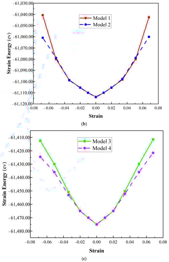 Strain energy versus strain for uniaxial strain (a) defect-free, (b) Model 1 and Model 2, (c) Model 3 and Model 4 of α-Al2O3 configuration.