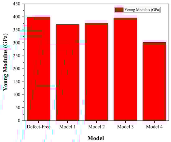 Young’s modulus for defect-free, Model 1, Model 2, Model 3, and Model 4 of α-Al2O3 configuration.