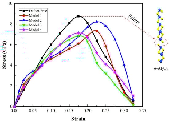 where U is the total energy and Ω represents the supercell volume [32]. Following that, the tensile stress-strain curve is obtained (Figure 5). The stress–strain curves under five distinct conditions, encompassing defect-free vacancy Models 1 and 2 (oxygen vacancy) and vacancy Models 3 and 4 (aluminum vacancy), are illustrated.