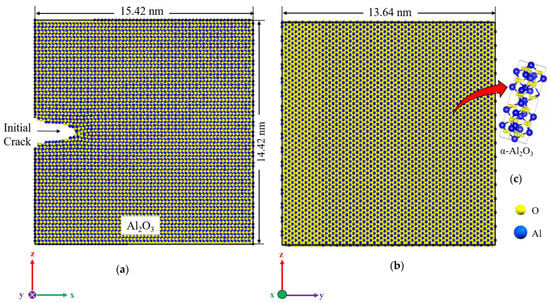 The lattice parameters for hexagonal α- Al2O3 are a = b = 4.805 Å, c = 13.116 Å, α = β = 90°, and γ = 120°. MD simulations were conducted using the open-source program large-scale atomic/molecular massively parallel simulator (LAMMPS) package [51]. In order to visualize the evolution of the atomic structure, the open visualization tool OVITO [52] was utilized. Newton’s second law is used to obtain the kinematic parameters of particles using the molecular dynamics method. Therefore, the atomistic model should incorporate appropriate potential functions representing atomic interactions. An ab initio calculation or experimental data were used to determine the parameters of a potential function. The COMB3 [53] potential was utilized for system relaxation, and the simulation box dimensions were set at 15.42 nm × 13.64 nm × 14.42 nm. The slab orientations were utilized along the X (100), Y (010), and Z (001) directions. The configuration’s boundary conditions were defined as non-periodic and shrink-wrapped (S) in one direction while being periodic in the other two directions. In this simulation, the relaxation of the simulation box was done within two steps. In the first step, the simulation box was kept at a constant temperature of 300 K in the NPT ensemble to allow the relaxation of the structure. In the second step, the isobaric-isothermal ensemble (NPT) was used for 30 ps to keep the constant temperature of 300 K and impose the pressure of 1 bar to get the initial physical state of the material. At the simulation box, a crack tip was introduced at the edge of the box (Figure 1) to facilitate crack propagation.
