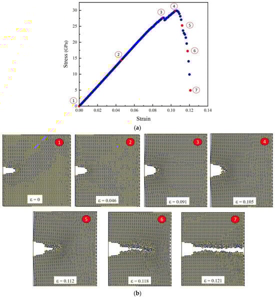 The initiation of a crack often occurs at locations of stress concentration, such as the tips of pre-existing defects within the material. These stress concentration sites are vulnerable areas where the material is more prone to failure. When the applied stress surpasses the critical strength, the material undergoes a process known as nucleation [41], where atomic bonds start to break, creating a small crack. It is evident that the stress near the crack tip gradually increases as the loading continues at the initial stage. When the stress reaches the critical value, the atoms surrounding the crack tip start to separate, indicating the initiation of a crack. Subsequently, cracking begins and increases steadily. At Points 5 and 6, the elongation is and , respectively, while the crack propagates horizontally with an increase in displacement. Ultimately, at Point 7, the stress gradually diminishes until the propagation stops, and the crack reaches the end of its path, leading to failure.