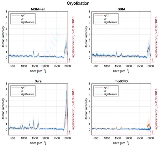 Mean spectra of the sample measurements in native and cryofixed conditions, with separation significance indicated on the bottom row in red. The significance at each single Raman shift (0 = null hypothesis, 1 = alternative hypothesis) is calculated using the Wilcoxon-Mann-Whitney-U test, and the p-value is Bonferroni-corrected (0.05/1613). This visualization reveals no discernible distinction in the spectra between the two conditions. Meningothelial meningioma (MGM_men, 31 native spectra and 21 CF spectra), dura mater (Dura, 24 native spectra and 12 CF spectra), glioblastoma (GBM, 38 native spectra and 22 CF spectra), modified CNS tissue (modCNS, 3 native spectra and 2 CF spectra) Note that both native and frozen samples gave very low intensity spectra compared to other specimens, likely due to the optical properties of the particular specimen. Modified CNS tissue is a tumor surrounding healthy brain tissue, revealing hypoxic and hemorrhagic changes.
