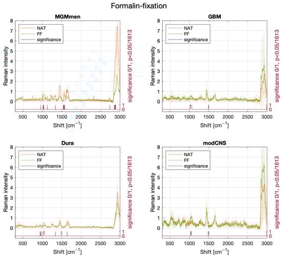 Mean spectra of the sample measurements in native and formalin-fixed conditions, with significantly different wavenumbers indicated on the bottom row in red. The significance at each single Raman shift (0 = null hypothesis, 1 = alternative hypothesis) is calculated using the Wilcoxon-Mann-Whitney-U test, and the p-value is Bonferroni-corrected (0.05/1613). As can be seen on the significant difference scale, formalin-fixation induces changes in the Raman spectrum at different sites for the different tissue entities depending on the molecular composition of the samples. Meningothelial meningioma (MGM_men, 13 native spectra and 17 FF spectra), dura mater (Dura, 25 native spectra and 43 FF spectra), glioblastoma (GBM, 49 native spectra and 24 FF spectra), and modified CNS tissue (modCNS, 32 native spectra and 51 FF spectra).