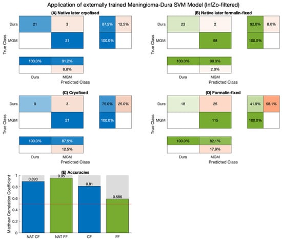 Applying an externally trained dual-class Support Vector Machine classifier to the samples under native and various fixed conditions, where cryo-fixed is labelled blue, formalin fixed green. The classification of meningioma and dura mater samples in native (A) and the classification in cryofixed conditions (C) reveals similar performance. In contrast, the classification of formalin fixed samples diminishes the classifier accuracy (D) compared to the native conditions (B) classifier results. (E) Overview comparing the classifier Matthews’ correlation coefficients.
