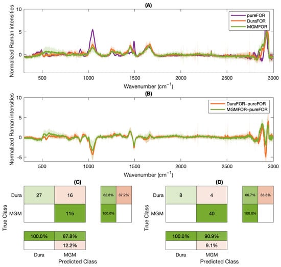 (A) Mean spectra of either formalin-fixed dura mater (DuraFOR, orange) or meningioma (MGMFOR, green), as well as pure-formalin (pureFOR, purple). (B) Differential spectrum obtained by subtracting the pure formalin spectrum from the average formalin-fixed dura mater (DuraFOR-pureFOR) or meningioma spectrum (MGMFOR-pureFOR), respectively. (C) Descriptive statistics after application of the externally trained meningioma/dura mater classifier on the differential spectra (MCC 74.2%). (D) Output of a separately trained classifier based on the subtracted spectra (MCC 77.9%). Validation was performed on an external data set.