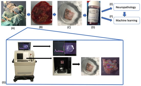 Sample workflow and spectrometer setup. (A) Intraoperative sampling. (B) First scan in native conditions. (C) Second scan in fixed conditions, either cryofixed on dry ice or formalin fixed. (D) After the measurement, the samples were stored in formalin solution and (E) sent to neuropathology for analysis. (F) Every spectrum was attributed with a neuropathological tag according to the results and then used for machine learning. (G) Setup of the robotized Raman-spectrometer system (Solais™, Synaptive®, Toronto, ON, Canada) with the display of exemplary spectra and the visible light image, where the measuring point locations were defined before (top row) as well as the movable stage for the sample placement. For reduction in- background noise, the samples were measured on aluminum dishes, which were put on dry ice for cryofixation purposes (bottom row).