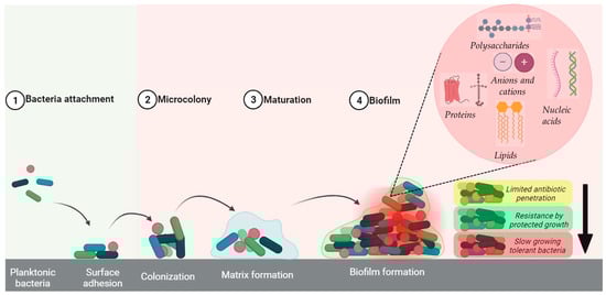 Bacterial colonization and biofilm formation on a medical implant (created with BioRender.com (accessed on 29 February 2024)).
