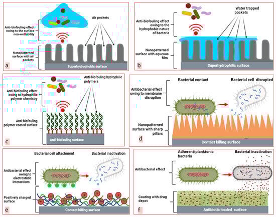 Biofilm prevention strategies. Design of anti-biofouling superhydrophobic surfaces (a), anti-biofouling superhydrophilic surfaces (b), anti-biofouling polymeric coatings (c), nanopatterned contact killing surfaces (d), contact-killing polymeric coatings (e), and antibiotic coatings (f) (created with BioRender.com (accessed on 15 February 2024)).