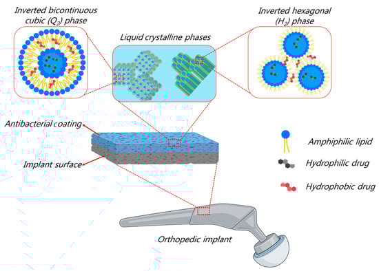 In the development of safe, multifunctional, and efficient coatings for the prevention of bacterial biofilm infections on orthopedic implants, recent advances focus on exploring biomimetic approaches through the use of naturally occurring compounds or structures in the design of coatings or in implant surface modifications by chemical or topographical processes [41]. Among others, lamellar and non-lamellar liquid crystalline phases, particularly inverse bicontinuous cubic (Q2) and hexagonal (H2) phases, may find application in next-generation antibacterial coatings, as depicted in Figure 3. This is attributed to their unique nanostructural versatility, the biocompatibility of their major lipid constituents (such as monounsaturated monoglycerides, diunsaturated monoglycerides, and omega-3 fatty acid monoglycerides), bioadhesive properties, and capability of loading and sustaining the release of amphiphilic, hydrophobic, and hydrophilic drugs [112,113,114,115,116,117,118,119,120,121,122,123]. Further, it is worth exploring the possible functionalization of hydrogels or polymeric matrices by embedding the corresponding nanoparticles of the inverse non-lamellar lyotropic liquid crystalline phases (particularly cubosomes and hexosomes), which are recently popular nano-self-assemblies in the development of nanocarriers for drug delivery applications [124,125,126,127,128,129,130,131,132,133,134,135,136,137,138,139,140,141,142], or through their immobilization for designing cubosome or hexosome coatings by employing chemical surface activation methods. The latter strategy is typically applied for immobilization of lamellar liquid crystalline nanoparticles (liposomes) and various soft and hard nanoparticles (such as silver nanoparticles) [49,70,72,105]. The design of such antibacterial coatings through the use of non-lamellar phases is rarely investigated [143]. Among the few published reports, Zabara et al. [65] reported on the formation and characterization of liquid crystalline coatings for silicon wafers, which are loaded with the antimicrobial peptide LL-37 and based on monoolein. They had antibacterial activity against Gram-negative and Gram-positive bacteria.