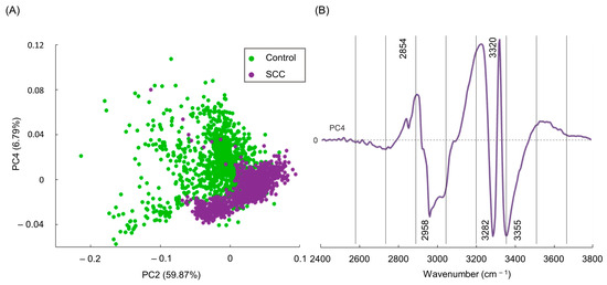 Figure 2. (A) PCA score of FTIR data (PC2 vs. PC4) for cryopreserved normal vs. SCC human cervical tissue and (B) respective PC4 loading plot of the FTIR high-wavenumber region.