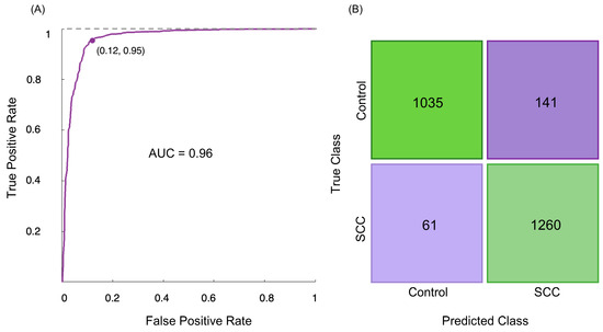 Upon determination of the principal component that effectively differentiated between normal and cervical SCC groups, along with the identification of spectral bands that can be considered biomarkers of cervical cancer, a classification model was constructed to classify the samples based on the reduced data from the PCA. The FTIR classifiers were developed using a SVM procedure, which is a supervised machine learning algorithm applied to classify the samples based on a 5-fold cross-validation method [56,57]. Upon using the classification learner generated by MATLAB, a receiver operating characteristic (ROC) curve (Figure 3A) was constructed at different discriminating threshold levels, showing the performance of the classification model created to distinguish cervical SCC from normal tissue. The corresponding ROC curve displayed the performance of the classification model with an area under the curve (AUC) of 0.96, where an AUC of 1.0 corresponds to a perfect classification test.