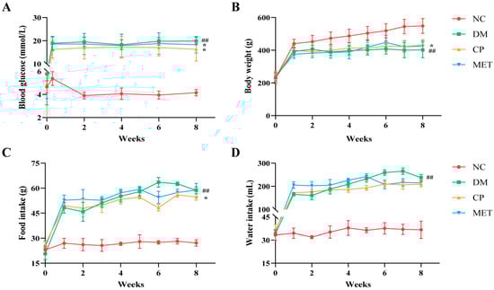 Blood glucose, body weight, food intake, and water intake of the rats in each group. (A) Blood glucose. (B) Body weight. (C) Food intake. (D) Water intake. NC, normal control group; DM, diabetic model group; CP, diabetic rats treated with CP (5 mg∙kg−1∙d−1); MET, diabetic rats treated with metformin (200 mg∙kg−1∙d−1). The values are presented as mean ± SD. In comparison to the NC group, (##) p < 0.01. In comparison to the DM group, (*) p < 0.05.