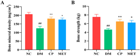 As shown in Figure 2, the BMD and bone strength of the femur in the DM group were remarkedly reduced (p < 0.01 vs. NC); However, after administration, femur BMD and bone strength were obviously improved in the CP and MET groups (p < 0.05 vs. DM), indicated that skeletal status of diabetic rats was improved after CP administration.