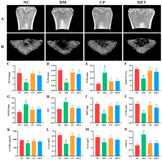 As indicated in Figure 3, compared with the NC group, the bone trabecular in the DM group was sparse and loose, with a large number of fractures, and trabecular number (Tb.N), trabecular thickness (Tb.Th), relative bone volume (Tb.BV/TV), bone mineral content (BMC), cortical bone thickness (Ct.Th), cortical bone density (Ct.TMD), cortical bone area (Ct.Ar), and total cortical bone area (Tt.Ar) were obviously decreased (p < 0.01). After CP intervention, Tb.Th, Tb.BV/TV, Ct.Th, Ct.TMD and Ct.Ar in the CP group were significantly increased (p < 0.01 vs. DM); trabecular separation (Tb.Sp), trabecular bone pattern factor (Tb.Pf), structural model index (SMI), and percentage of bone marrow cavity area (%Ma.Ar) were decreased significantly (p < 0.05 vs. DM). These results indicated that CP could repair bone structure in diabetic rats.