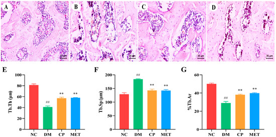The femoral morphology of the rats in each group. (A–D) H&E staining of femoral tissues, magnification of 400×; (E) Tb.Th of femur; (F) Tb.Sp of femur; (G) %Tb.Ar of femur. The values are presented as mean ± SD. In comparison to the NC group, (##) p < 0.01. In comparison to the DM group, (**) p < 0.01.