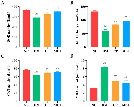 The levels of serum oxidative stress-associated enzymes in each group. (A) SOD; (B) GSH; (C) CAT; (D) MDA. The values are presented as mean ± SD. In comparison to the NC group, (##) p < 0.01. In comparison to the DM group, (**) p < 0.01, (*) p < 0.05.