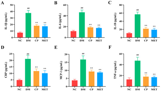 Expression levels of serum inflammatory cytokines in each group. (A) IL-1β; (B) IL-6; (C) IL-18; (D) CRP; (E) MCP-1; (F) TNF-α. The values are presented as mean ± SD. In comparison to the NC group, (##) p < 0.01. In comparison to the DM group, (**) p < 0.01.